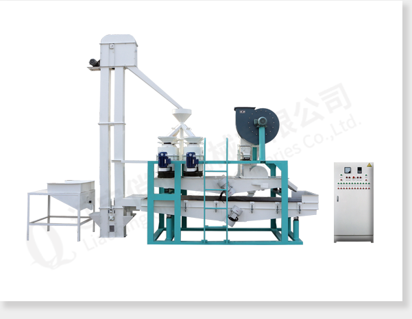 ① 上料斗② 斗式提升機 ③ 脫殼、風(fēng)選、分選主機 ④ 吸風(fēng)回料 ⑤ 籽仁復(fù)選機 ⑥ 風(fēng)選除皮篩 ⑦ 接料斗 ⑧ 電氣控制柜
